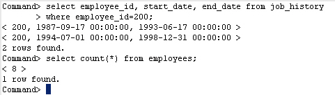 select count(*) from employees;d. When performing a WHERE clause query against a child cache table, both the child and parent records will be loaded into the cache database. select employee_id, start_date, end_date from job_history where employee_id=200;