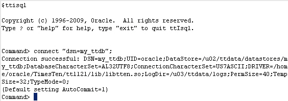 a. The main TimesTen daemon process or the TimesTen Windows service must be running before you can create a database. Only the instance administrator is authorized to start the daemon. The utility ttDaemonAdmin is used to start the daemon. Enter ttdaemonadmin -start on the OS command line to start the daemon, if it has not been started. ttdaemonadmin -start Note. ttdaemonadmin and other TimesTen database utilities are located in the install_dir/bin directory. To make these utilities readily available, include the bin directory in the PATH environment variable, or run the ttenv script to set up your TimesTen environment. Refer to the section "Environment variables" in the Oracle TimesTen In-Memory Database Installation Guide for more information. b. Enter ttisql at the OS command prompt to launch ttIsql. ttisql c. Enter connect "dsn=my_ttdb"; at the ttIsql command prompt . d. When the connect command returns, the database my_ttdb has been created and loaded into memory.