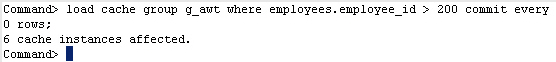 c. Enter the following LOAD CACHE GROUP statement in ttIsql to pre-load a dynamic cache group cacheadm.g_awt, with employees records where their id is greater than 200; load cache group g_awt where employees.employee_id > 200 commit every 0 rows; Note: For global cache groups, the LOAD CACHE GROUP statement will fail, if the cache instances are already present in the cache grid. After loading the data, the autorefresh state for read only cache groups will be changed to ON. Changes to the underlying autorefresh tables in Oracle will be applied to the cache tables once the defined refresh interval has been reached. For asynchronous writethrough cache groups, all updates in the cache database will be propagated to the Oracle database, once the replication agent process is up and running.