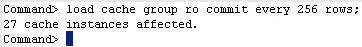 a. Log in to ttIsql and connect to cachedb1_1121 as the user cacheadm, passing in both the TimesTen and Oracle user passwords for cacheadm. connect "dsn=cachedb1_1121;uid=cacheadm;pwd=cacheadm;oraclepwd=cacheadm"; b. Enter the LOAD CACHE GROUP statement below in ttIsql, to populate the read-only cache group cacheadm.ro load cache group ro commit every 256 rows;