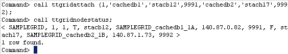 a. Step 14 is necessary only if there are global cache groups in the cache database, or if you need to perform global cache grid operations. Call the procedure ttGridAttach to add the current standby cache database to the cache grid. call ttgridattach (2,'cachedb1','stacb12',9991,'cachedb2','stach17',9992); Note: The first parameter 2, indicates that the current database is the second database in the parameter list. b. Use the procedure ttGridNodeStatus to list all attached grid members and verify that cachedb2_1121 has joined the cache grid samplegrid. call ttgridnodestatus;