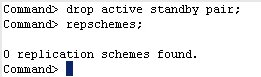 a. Remove the active standby pair schema by using the DROP ACTIVE STANDBY PAIR statement. Use the ttIsql command repschemes to verify that the replication scheme has been removed. drop active standby pair;
